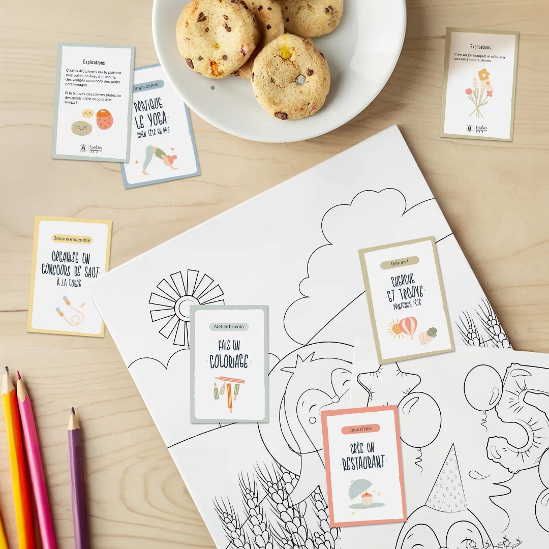 Une fois le temps d’écran écoulé, pas question de s’ennuyer ! Votre enfant pourra piocher parmi les 30 cartes activités réparties en 5 thèmes : “atelier bricolo”, “temps calme”, “dehors”, “jeux d’rôle” et “jouons ensemble”.