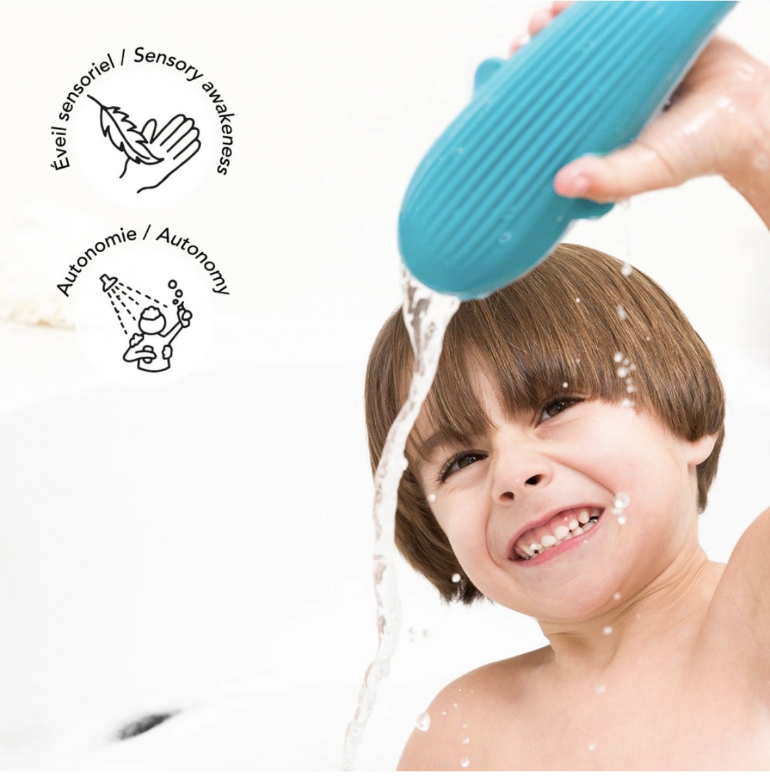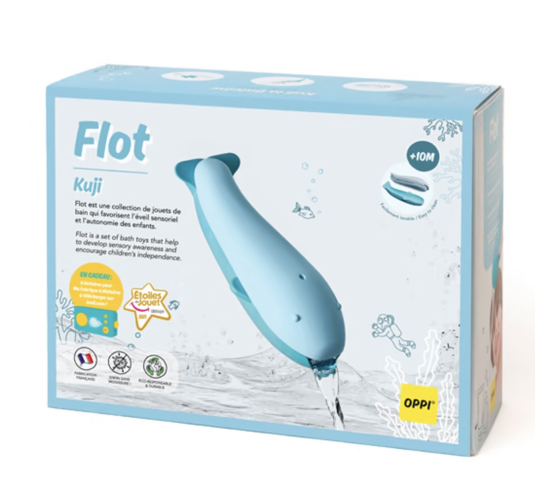 Kuji la baleine cache de nombreux trésors ! Elle accompagne vos petits curieux pour leur apprendre à se laver en autonomie… et avec le sourire ! Elle dévoile une brosse sensorielle dotée de petits picots pour que les enfants se nettoient le corps en douceur. Elle favorise l’éveil sensoriel, l’autonomie et aide les plus petits à développer leur motricité fine. Elle peut servir de récipient pour récolter de l’eau et se rincer les cheveux après le shampoing…ou tout simplement s’amuser avec l’eau du bain. Kuji est fabriquée en France et éco-conçue avec des matériaux naturels, biosourcés et recyclables. Conçue en…