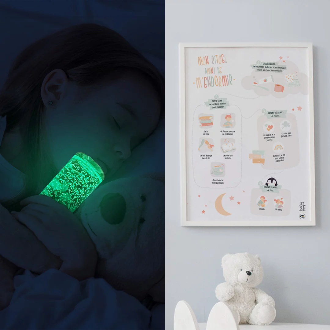 - Le poster de rituel du coucher : Ce poster l’aide à adopter une routine du coucher apaisante grâce à quatre étapes essentielles pour un coucher serein.