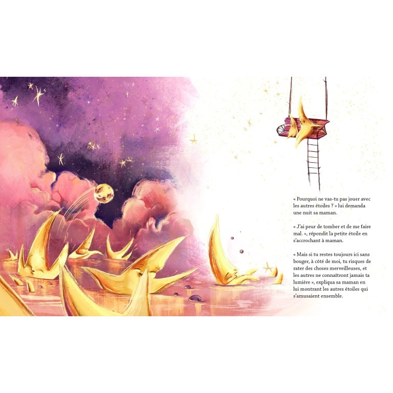 Dans un coin du ciel, au milieu de la Voie lactée, brillait une petite étoile. Chaque nuit, elle se réveillait, puis commençait à émettre sa lumière. Mais peu arrivaient à la voir, car la petite étoile ne quittait jamais son coin, à côté de sa maman. Autour d’elle, les autres étoiles dansaient avec les lucioles, couraient après les papillons de nuit, faisaient des chatouilles à la lune, indiquaient le chemin aux voyageurs égarés et filaient vers le sol quand quelqu’un voulait faire un voeu. Mais pas la petite étoile, qui restait fermement à sa place. Un livre sur l’importance de…