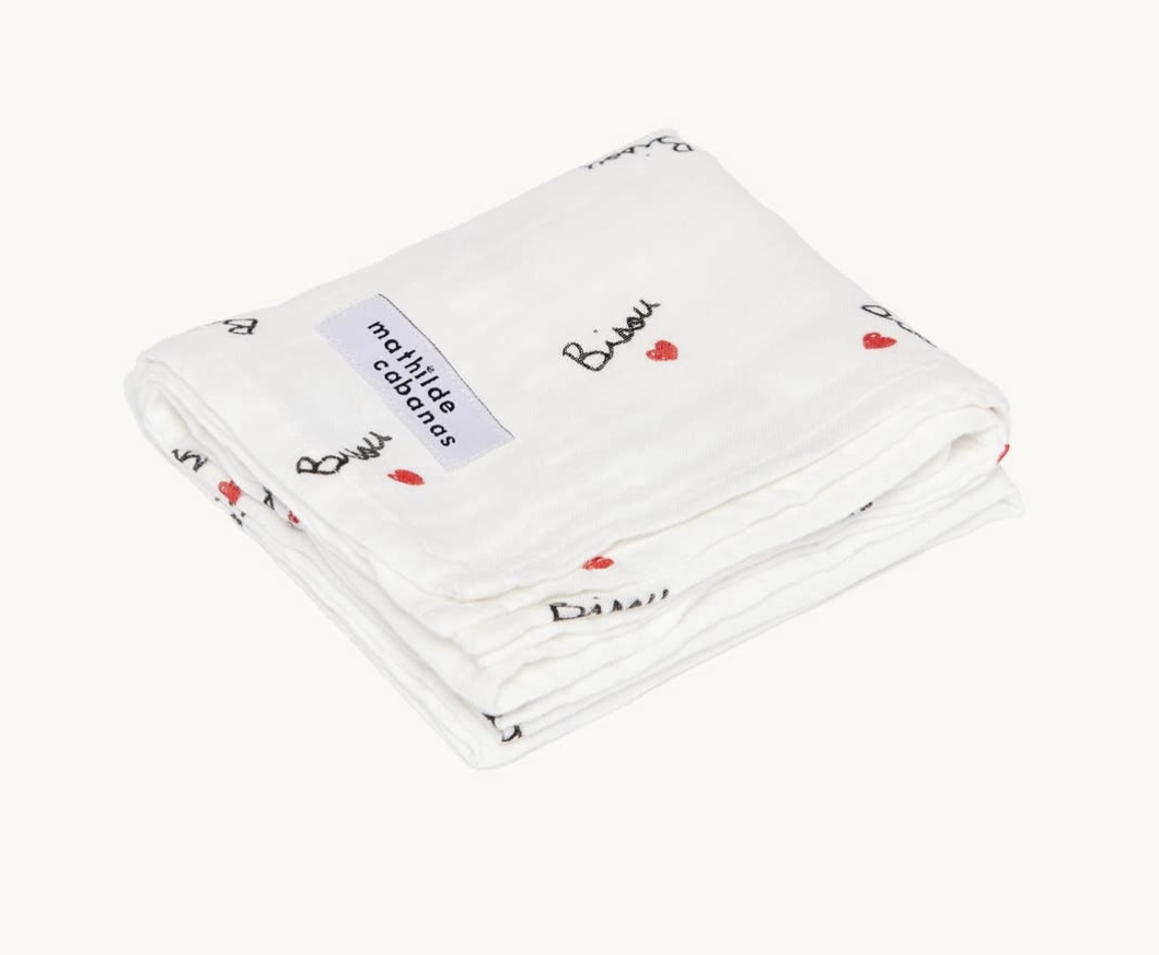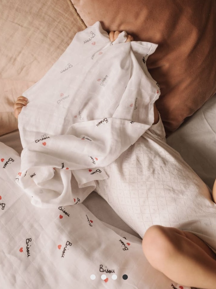 Le lange Bisou est paré à toutes les bavouilles des bébés. Il peut servir de doudou, pour mettre sur l’épaule après le biberon ou la tétée, sur la table à langer ou encore en balade. 100% coton Bio.