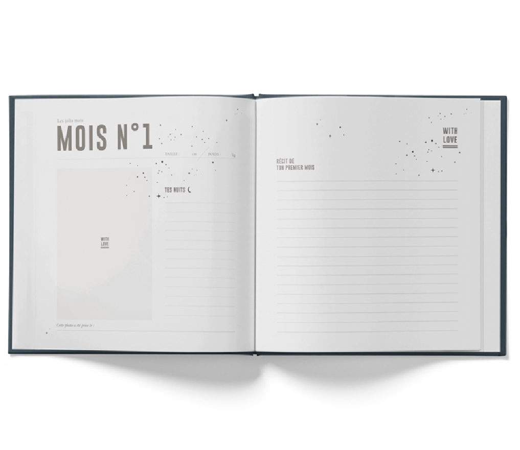 Le livre de naissance « céleste minéral » pour faire le récit de la naissance de bébé et de l’évolution mois par mois.