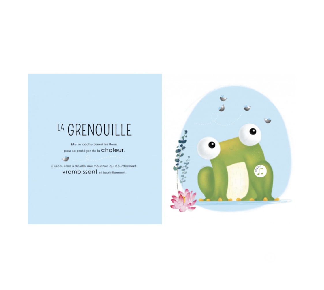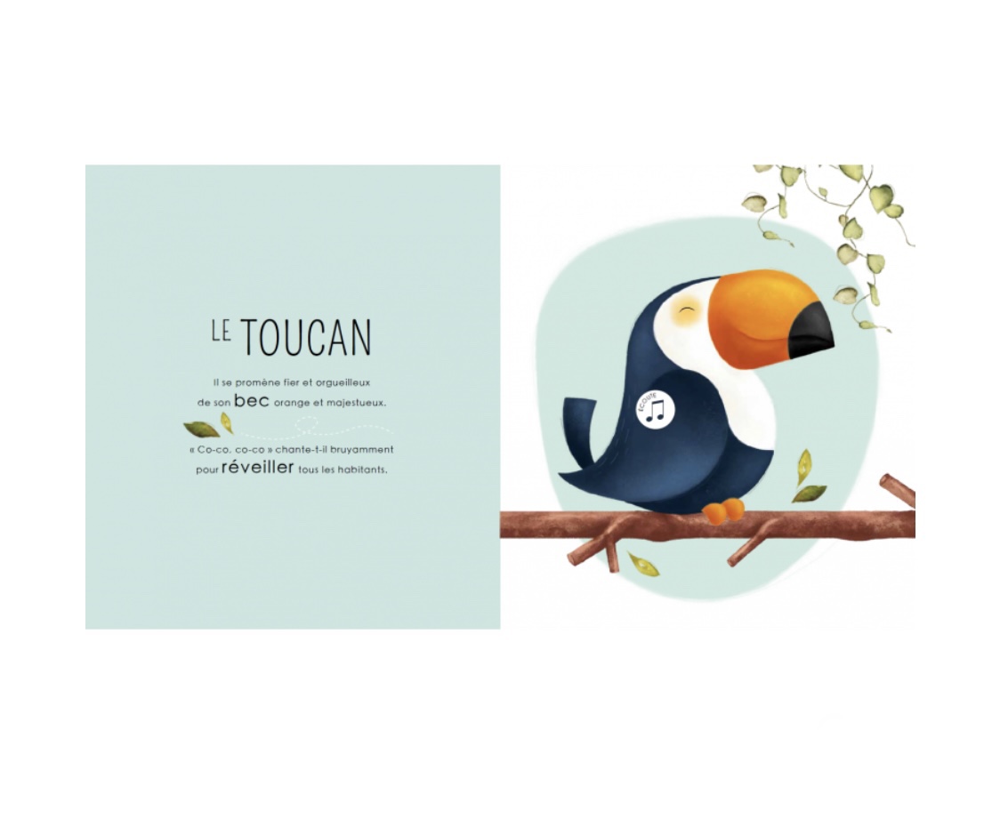 Feuillette les pages de ce livre pour découvrir les petits habitants de la jungle et appuie sur les boutons pour écouter leurs cris.