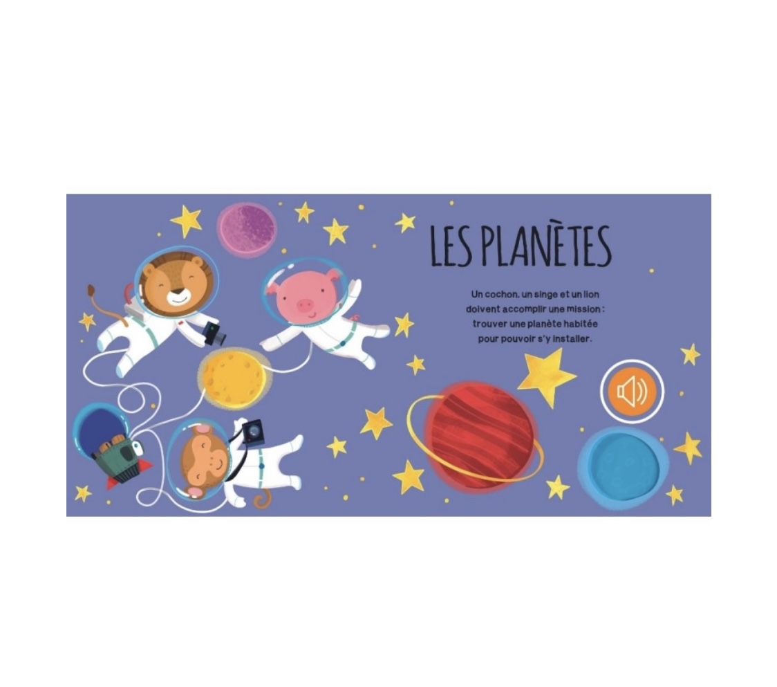 Voici les petits animaux de l’espace. Lis leurs aventures, appuie sur les boutons. Tire et pousse la poignée : tu entendras le bruit d’un radar spatial qui accompagnera ta lecture.