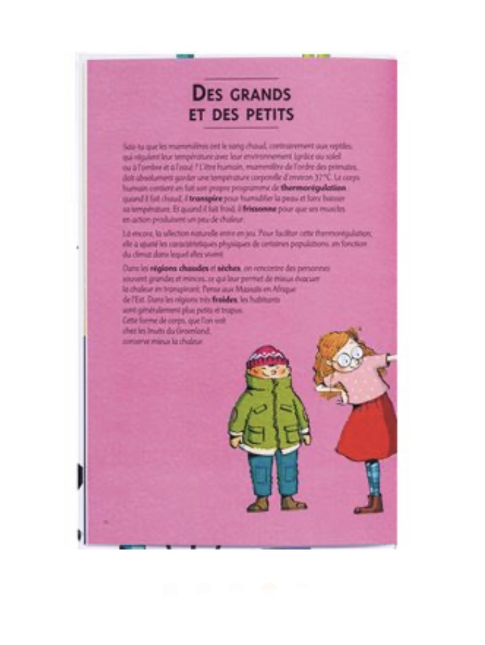 Après les titres Mon corps est génial !, explorons l’Histoire de l’humanité avec ces nouveaux ouvrages ! Connais-tu ton Histoire ? Celles des hommes, des femmes et des enfants qui, partis d’un même continent ont peuplé la Terre entière, et se sont incroyablement distingués. Regarde autour de toi : personne n’est identique, pourtant nous sommes tous humains ! Tout a commencé, il y a environ 150 000 ans, en plein cœur de l’Afrique… Comment les Hommes ont-ils découvert des territoires inexplorés, affronté de nouveaux climats ? Comment chaque nouvel environnement a-t-il façonné leur mode de vie, jusqu’à leur apparence physique ? D’où vient…