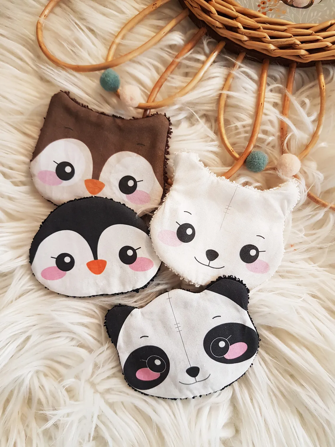 Lot de 4 petites lingettes animaux lavables (panda, lama, pingouin, hibou)