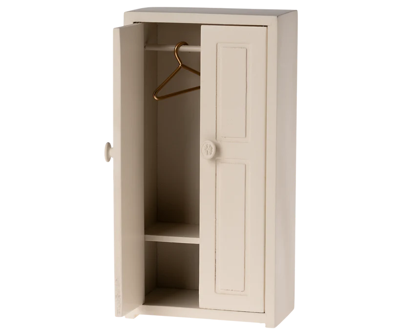 Cette petite armoire en bois permettra à la famille souris d’organiser sa garde-robe. La penderie est livrée avec 3 cintres dorés.