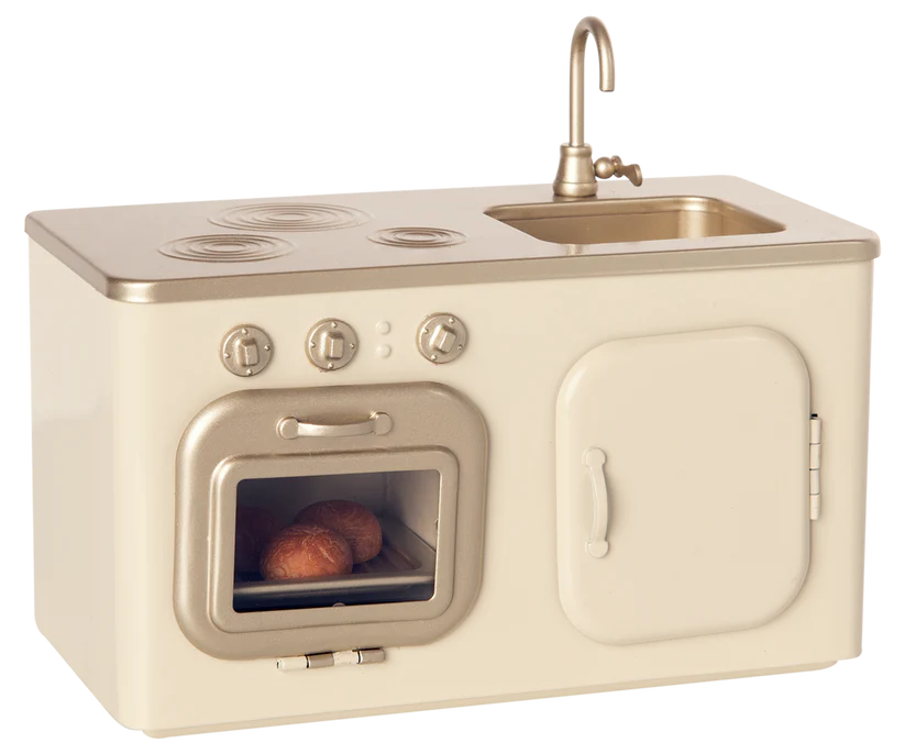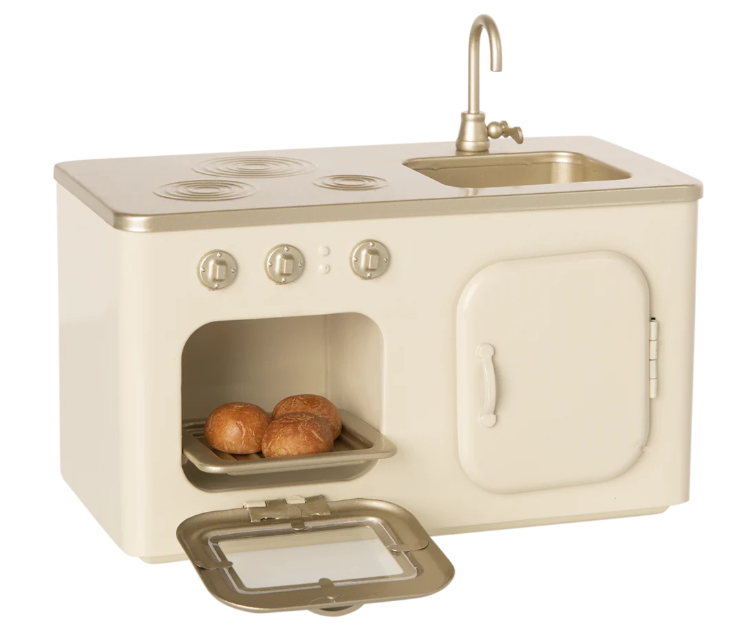 Notre belle cuisine miniature Maileg est un must have. La cuisine est équipée de 3 petits pains fraîchement sortis du four. De nombreuses heures de jeu sont assurées avec ce merveilleux produit.