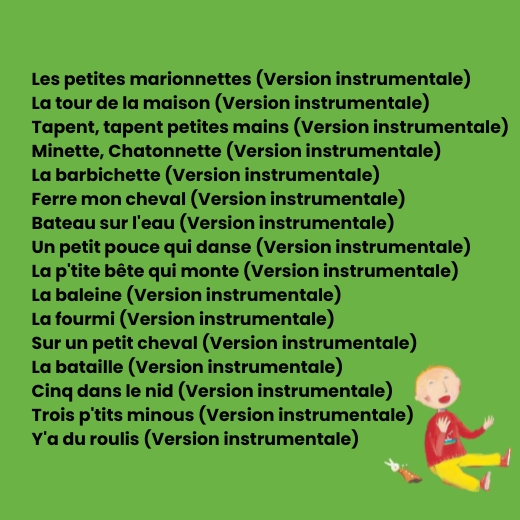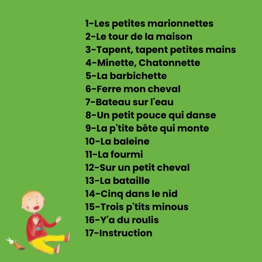 16 comptines pour jouer, chanter et s’amuser avec les tout-petits. 41 min d’écoute dont 21 min de version instrumentale