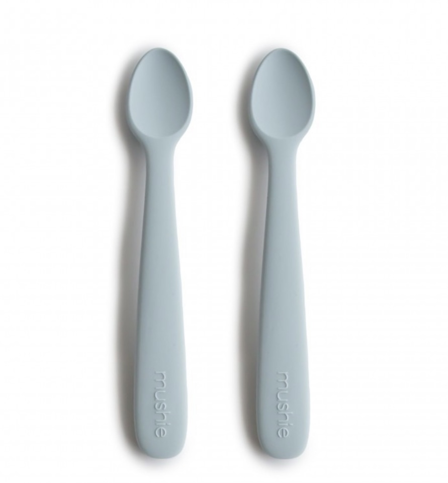 Ensemble de 2 cuillères Mushie en silicone de couleur « Powder Blue » au design simple et élégant.