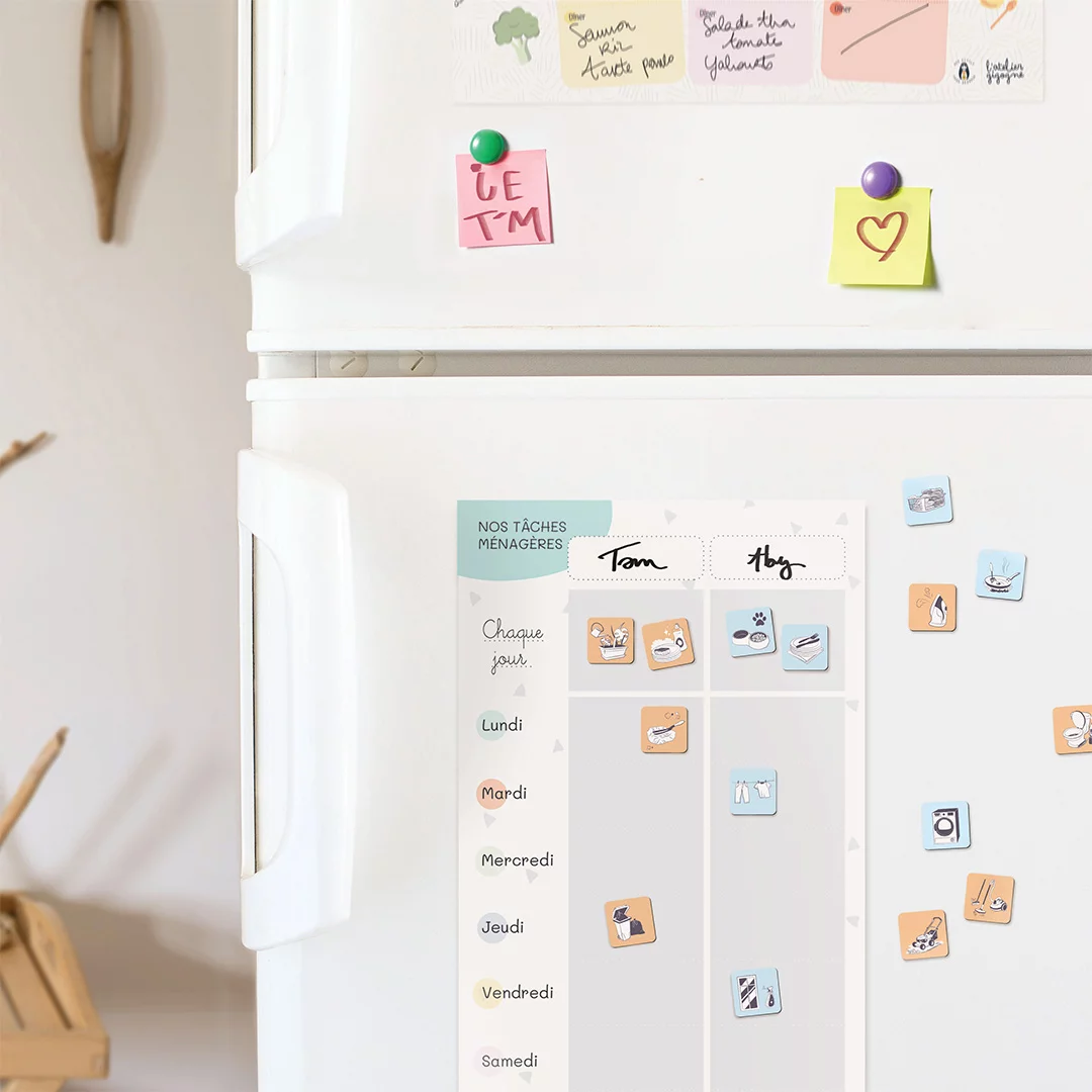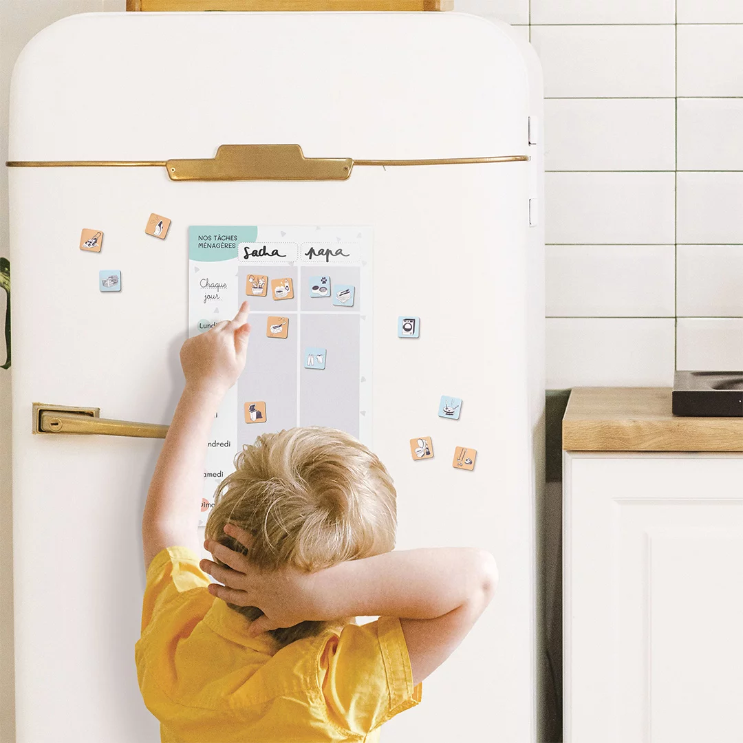 Grâce aux magnets colorés “mes petites missions”, chacun visualise facilement ce qu’il doit faire : 1 personne, 1 couleur ! Une méthode simple et motivante pour responsabiliser les enfants tout en allégeant la charge mentale des parents.