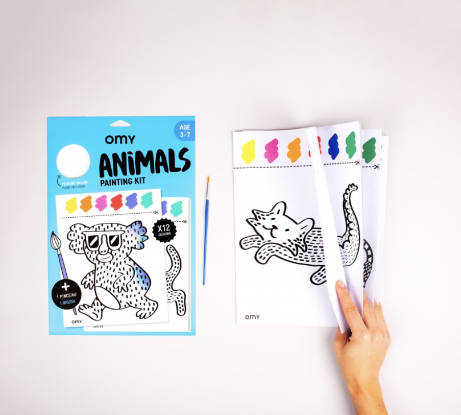 OMY – 12 feuilles illustrées + 1 pinceau + peinture à l’eau Une collection de 12 animaux fun à colorer !