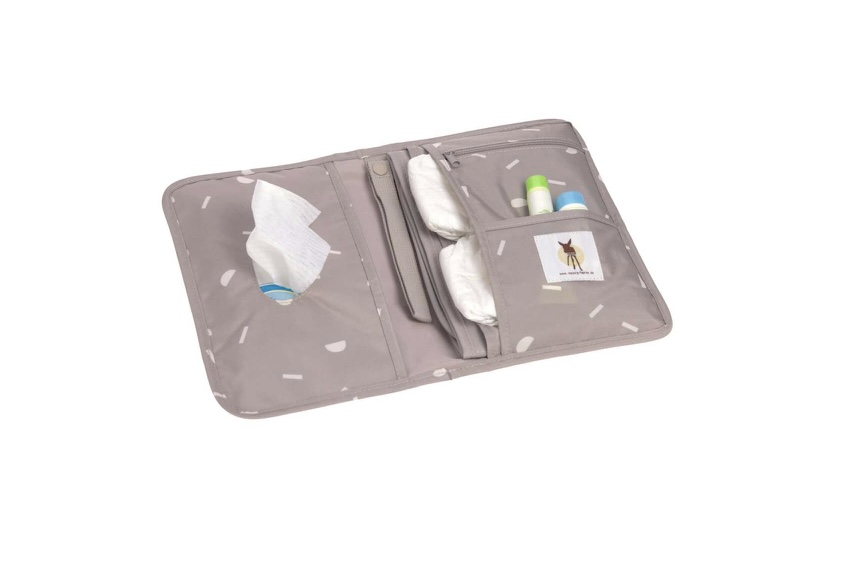 Des caractéristiques fonctionnelles permettent un change rapide et facile. Un compartiment pour les lingettes avec une ouverture pratique, plusieurs poches pour les couches et autres ; une poche zippée et une bande pour accrocher la tétine en font un accessoire de change très pratique.