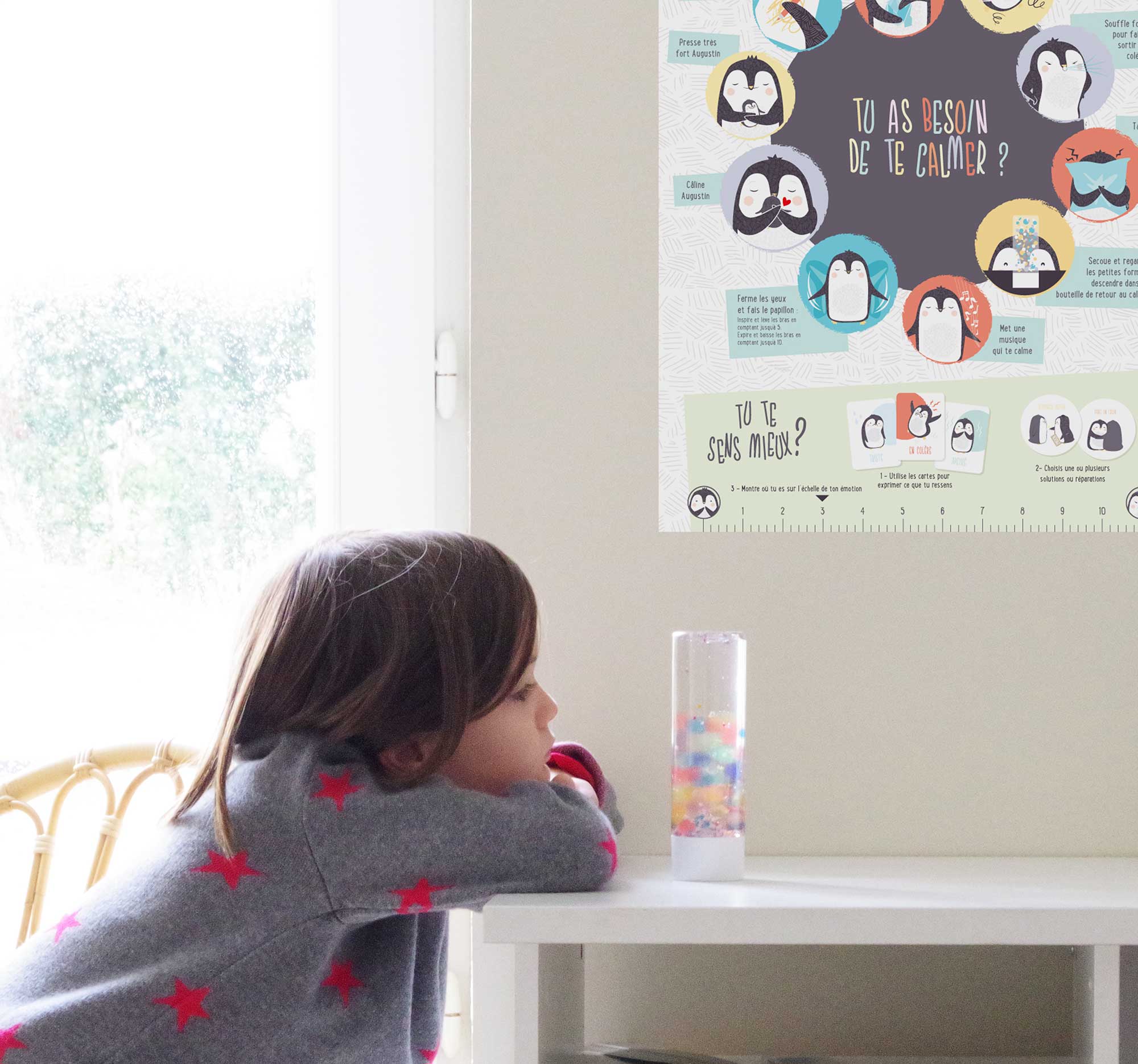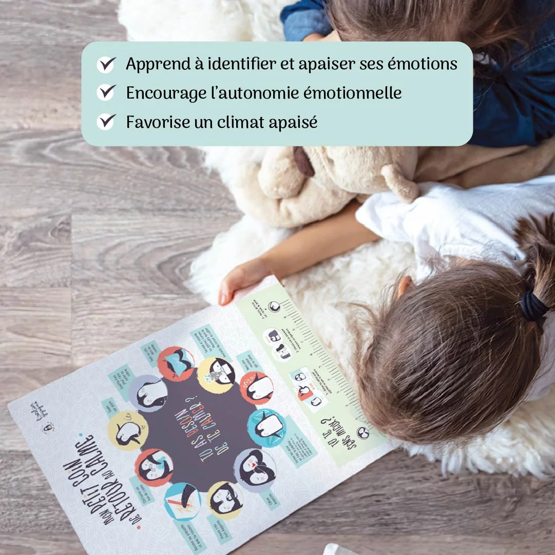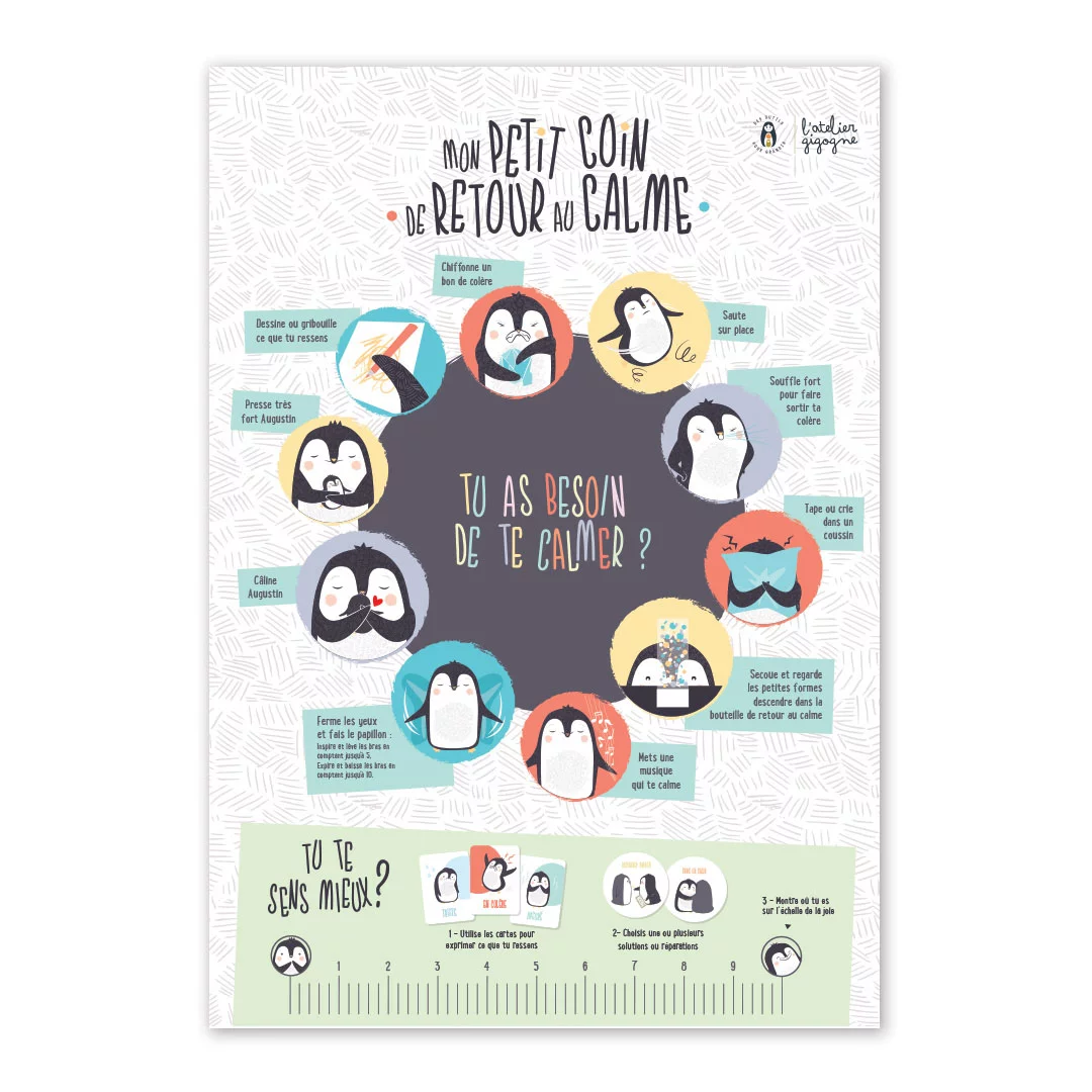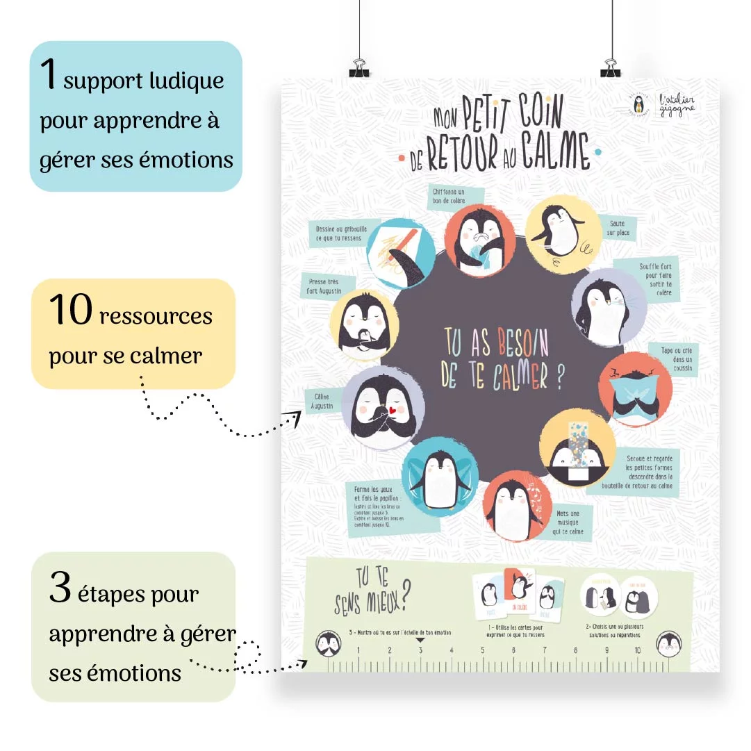 Cette affiche des émotions est un outil simple et visuel conçu pour aider votre enfant à comprendre ce qu’il ressent et à retrouver son calme en autonomie. Grâce à 10 ressources pour se calmer, représentées par Augustin le pingouin, votre enfant découvre des actions faciles pour s’apaiser lorsqu’il vit du stress, de la colère ou une émotion difficile.