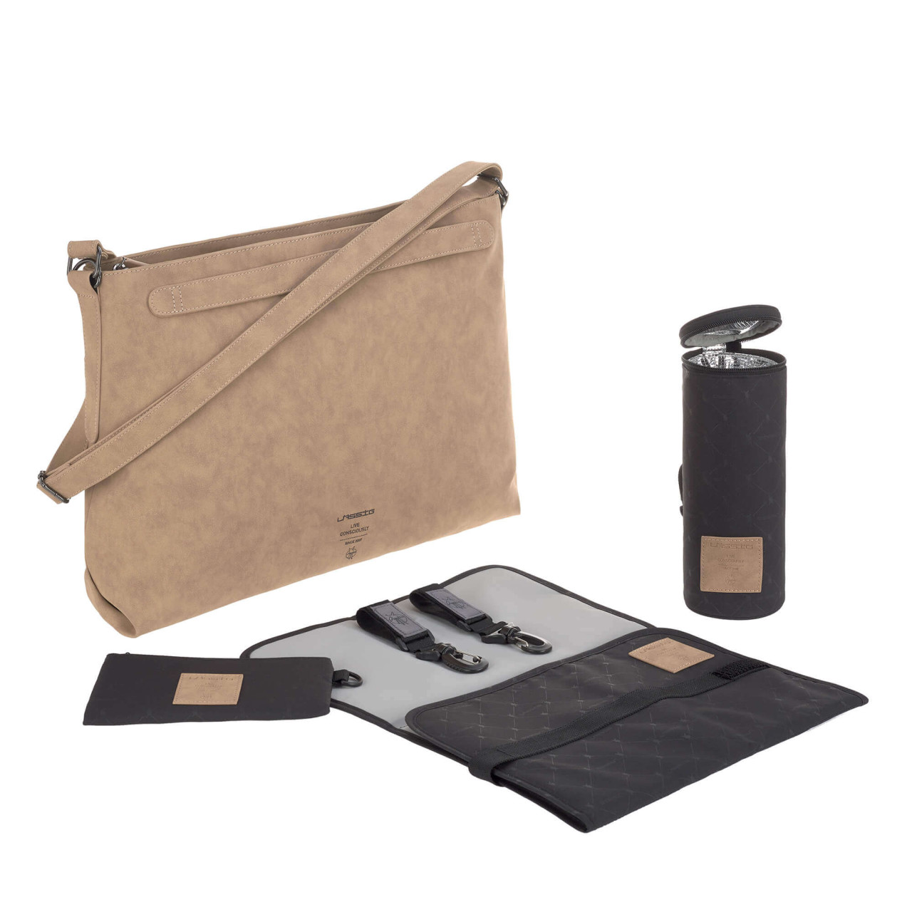 Le sac à langer vegan en chameau de LÄSSIG séduit par sa matière extérieure, de haute qualité, qui rappelle le cuir. Il attire tous les regards et séduit par son look urbain et classique à la fois.