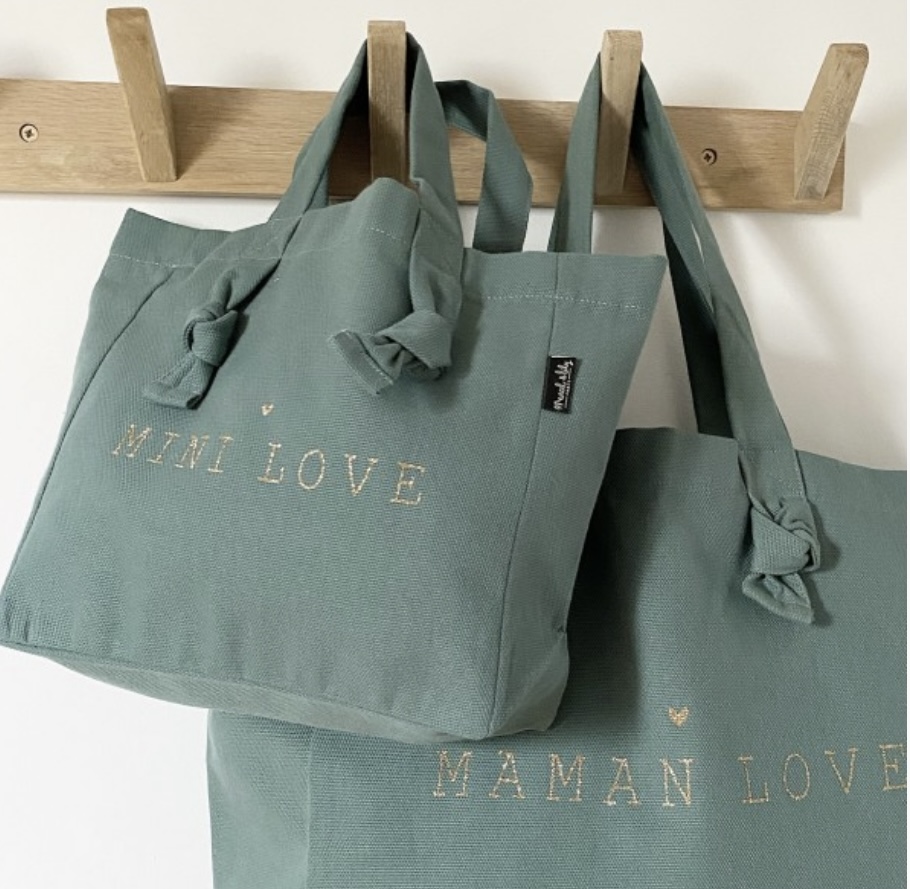 Craquez sur le nouveau Mini cabas « Mini Love » couleur eucalyptus pour faire comme maman, confectionné dans une jolie toile de coton certifiée Oeko Tex..