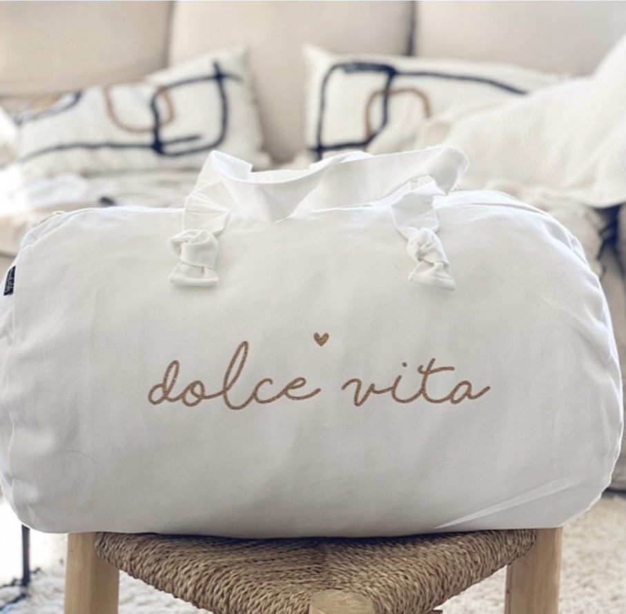 Craquez pour l’adorable sac polochon « Dolce Vita » trop canon confectionné dans une jolie toile de coton couleur blanc craie tissée en France avec son imprimé or pailleté.