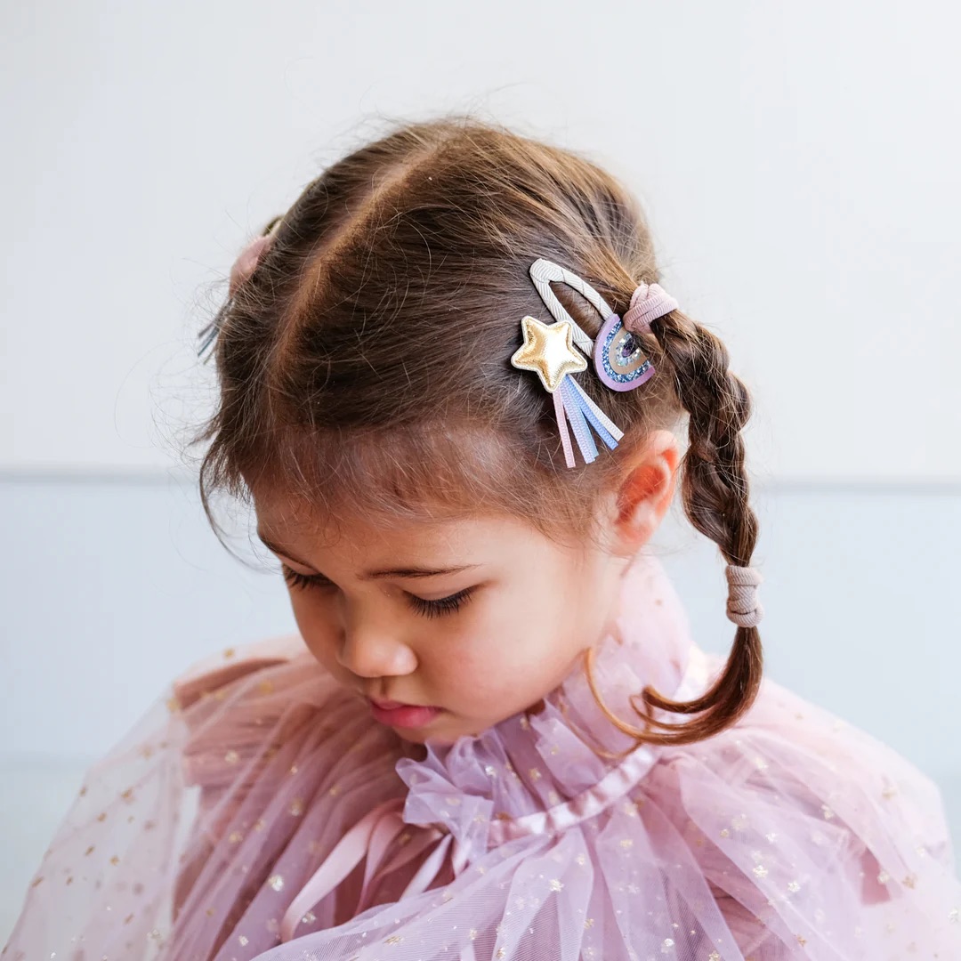 Le plus joyeux des petits paquets de pinces ! Deux arcs-en-ciel super doux et scintillants dans les plus jolies couleurs plus deux étoiles filantes avec des rubans colorés !