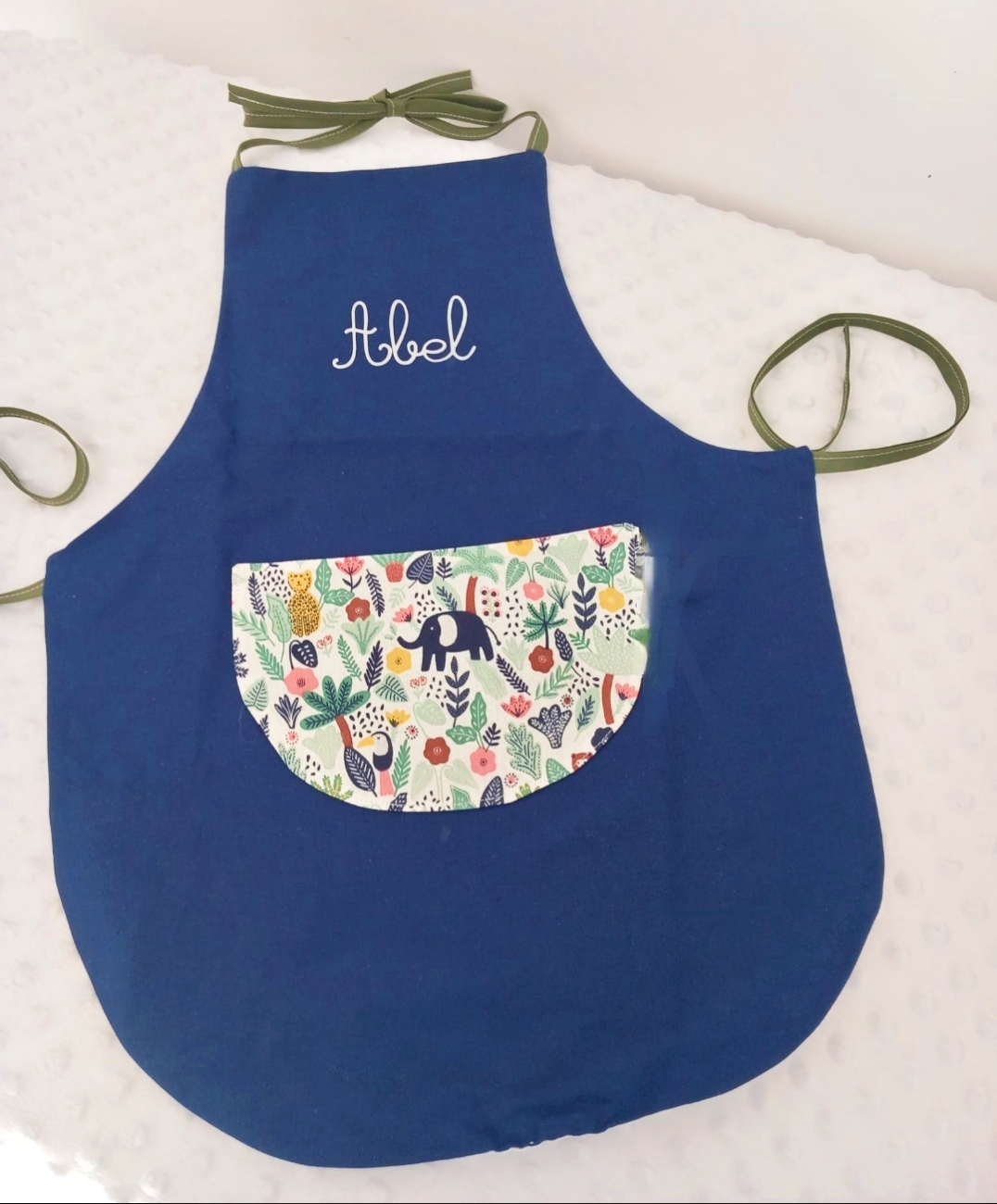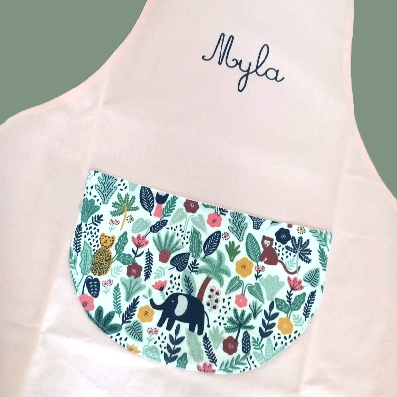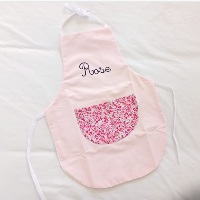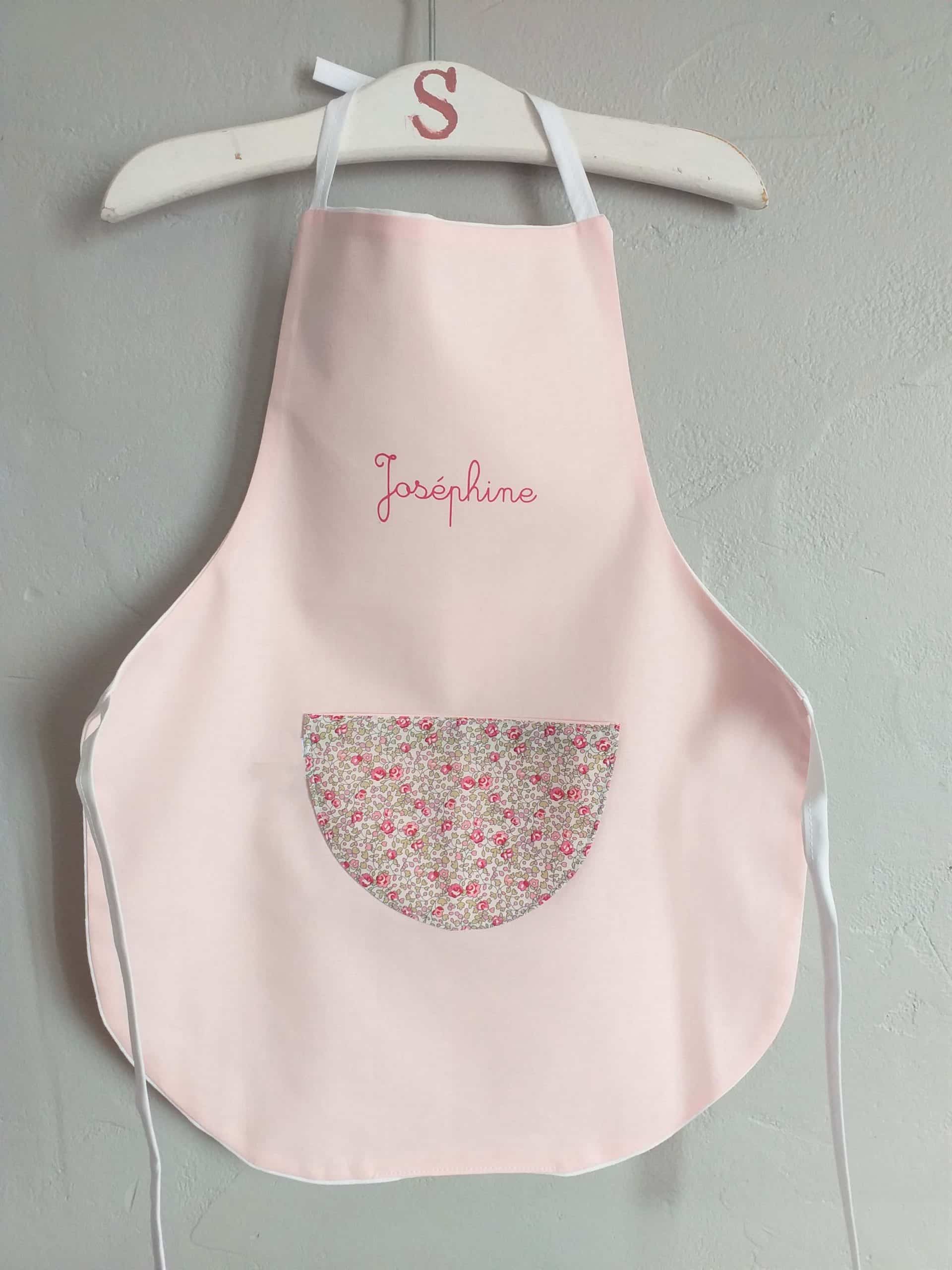- Le tablier enfant est disponible en différentes couleurs unies, pour garçon comme pour fille. Personnalisez tout simplement le tablier pour enfant en choisissant le tissu à motifs et la couleur du prénom, qui sera apposé sur le tablier.