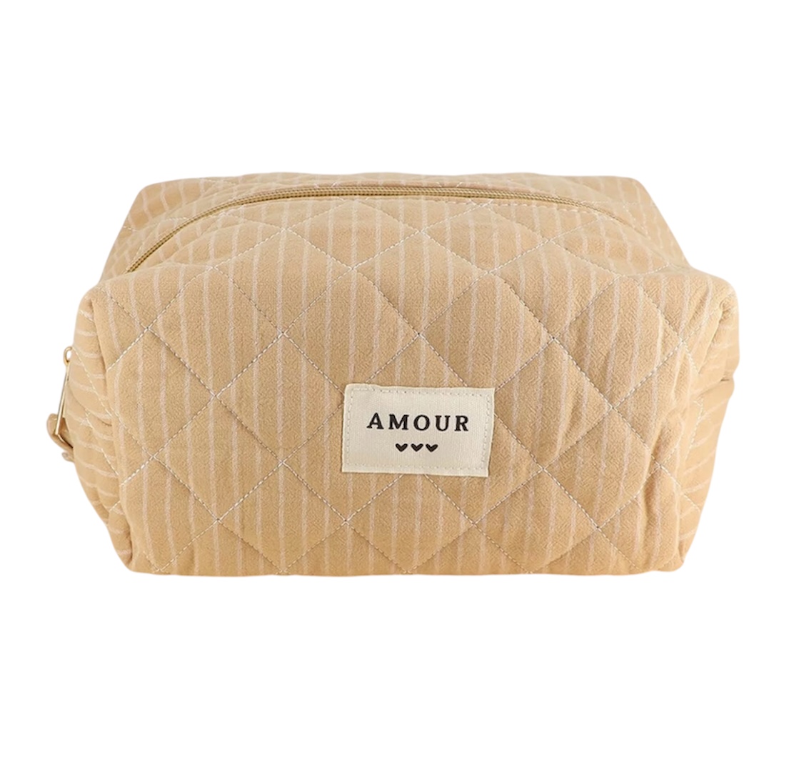 Grande trousse multi-usages, pratique pour y ranger tout type d’affaires (toilettes, maquillage etc.). Trousse côtelée avec de jolis motifs imprimés et embelli par un mot « »AMOUR » » suivi de 3 coeurs.