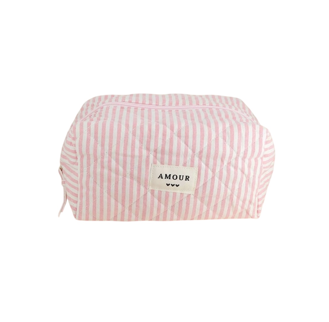 Grande trousse multi-usages, pratique pour y ranger tout type d’affaires (toilettes, maquillage etc.). Trousse côtelée avec de jolis motifs imprimés et embelli par un mot « »AMOUR » » suivi de 3 coeurs.