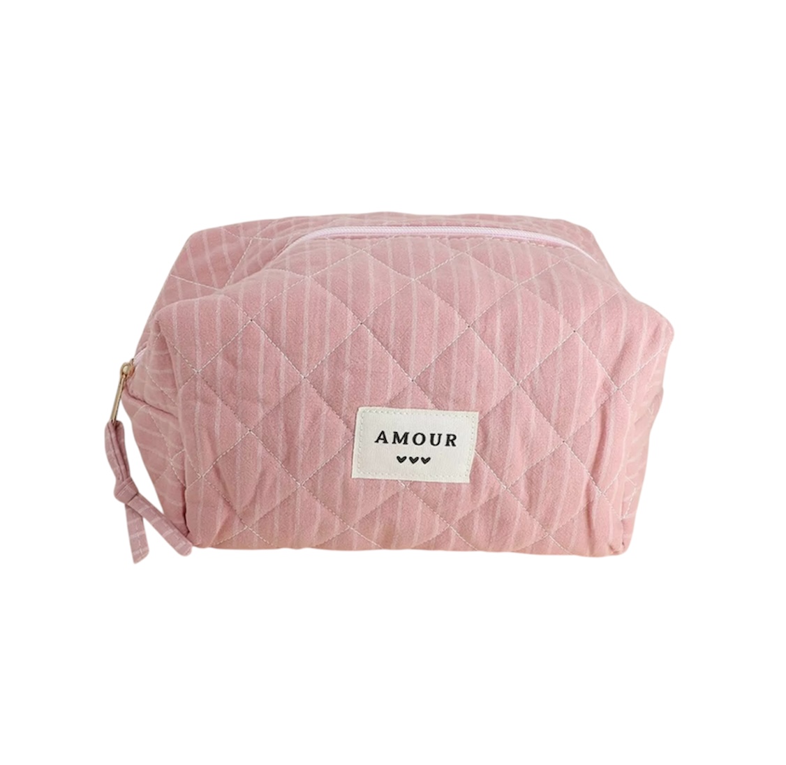 Grande trousse multi-usages, pratique pour y ranger tout type d’affaires (toilettes, maquillage etc.). Trousse côtelée avec de jolis motifs imprimés et embelli par un mot « »AMOUR » » suivi de 3 coeurs.