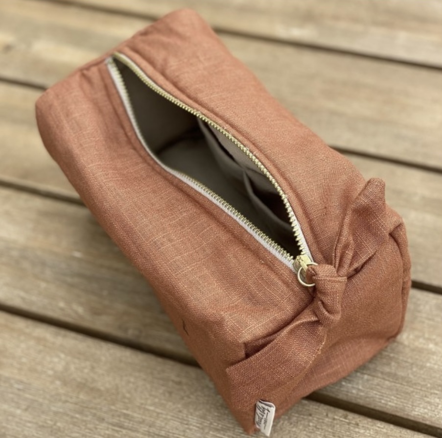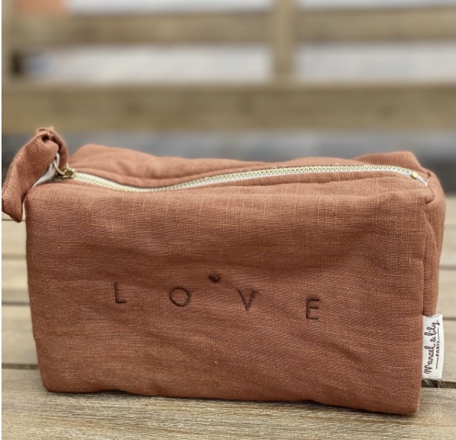 Nouvelle trousse en lin couleur cognac de forme rectangulaire avec sa jolie broderie LOVE pour y glisser tout votre joyeux bazar.
