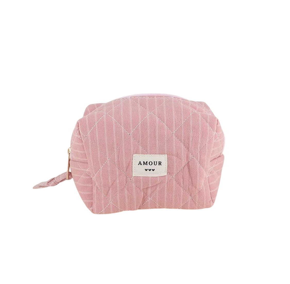 Trousse côtelée avec de jolis motifs graphiques et embelli par un mot « »AMOUR » » suivi de 3 coeurs.