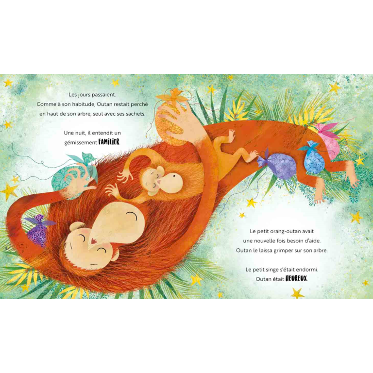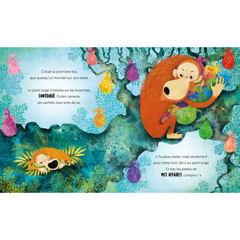 Orang-outan est très jaloux de ses affaires et ne laisse jamais personne s’en approcher. Jusqu’au jour oĂ¹, grĂ¢ce Ă l’amitiĂ©, il dĂ©couvre que le partage est le plus beau des cadeaux. Une douce histoire sur l’importance d’accorder la juste valeur aux choses.