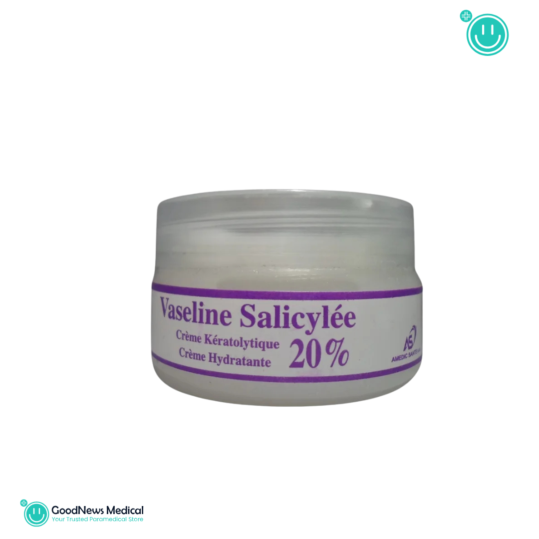 Préparation dermato-kératolytique à base de vaseline et d’acide salicylique dosé à 20 %, recommandée pour le traitement local des épaississements cutanés modérés à sévères (callosités, kératoses, psoriasis, cors). L’acide salicylique favorise l’élimination des cellules mortes, tandis que la vaseline hydrate et protège la peau.