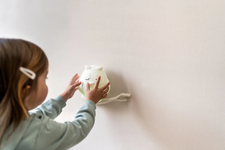 Cette veilleuse LED joyeuse est rechargeable par USB et change de couleur en tapotant son dos. Faites en sorte que la veilleuse s’éteigne automatiquement après 15 minutes ou choisissez de la laisser allumée toute la nuit, les deux options sont possibles via le bouton marche/arrêt. Sa texture douce permet aux enfants de se blottir contre lui en toute sécurité avant de les apaiser pour s’endormir ! Placez la branche sur le mur pour que la veilleuse soit retirée et reposée sur le mur.
