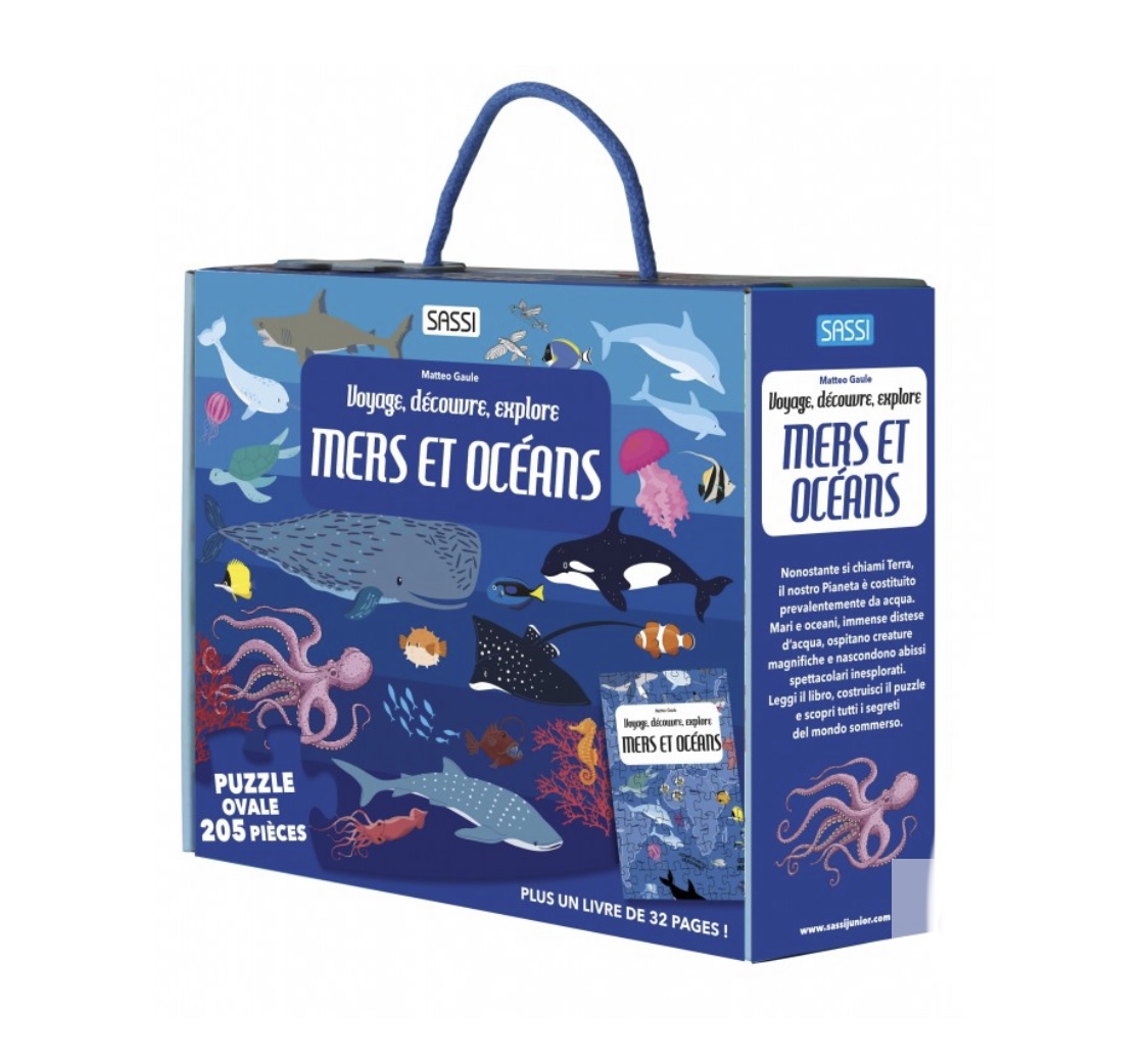Voyage, Découvre, Explore consacré aux mers et aux océans, pour en savoir plus sur le monde sous-marin grâce au livre de 32 pages et au puzzle de 205 pièces.