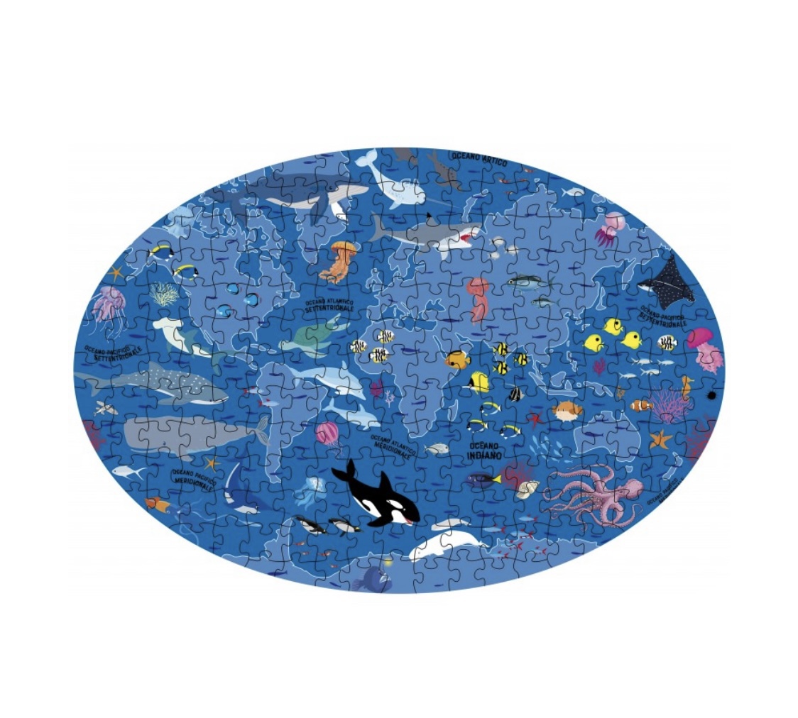 Bien qu’elle soit appelée Terre, notre planète est principalement composée d’eau. Les mers et les océans, immenses étendues d’eau salée, accueillent des créatures magnifiques et spectaculaire, cachent des trésors et permettent la vie même sur terre. Lis le livre de 32 pages pour découvrir tous les secrets du monde aquatique et construis le puzzle où tu trouveras les espèces animales et végétales que tu rencontreras entre les pages.
