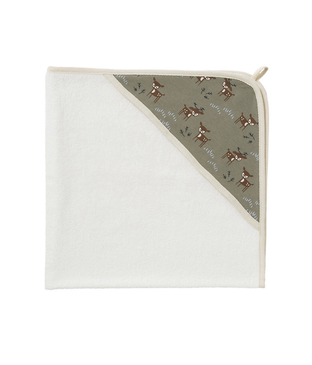 Jolie cape de bain en tissus éponge coton biologique avec un imprimé de petits faons, coloris olive.