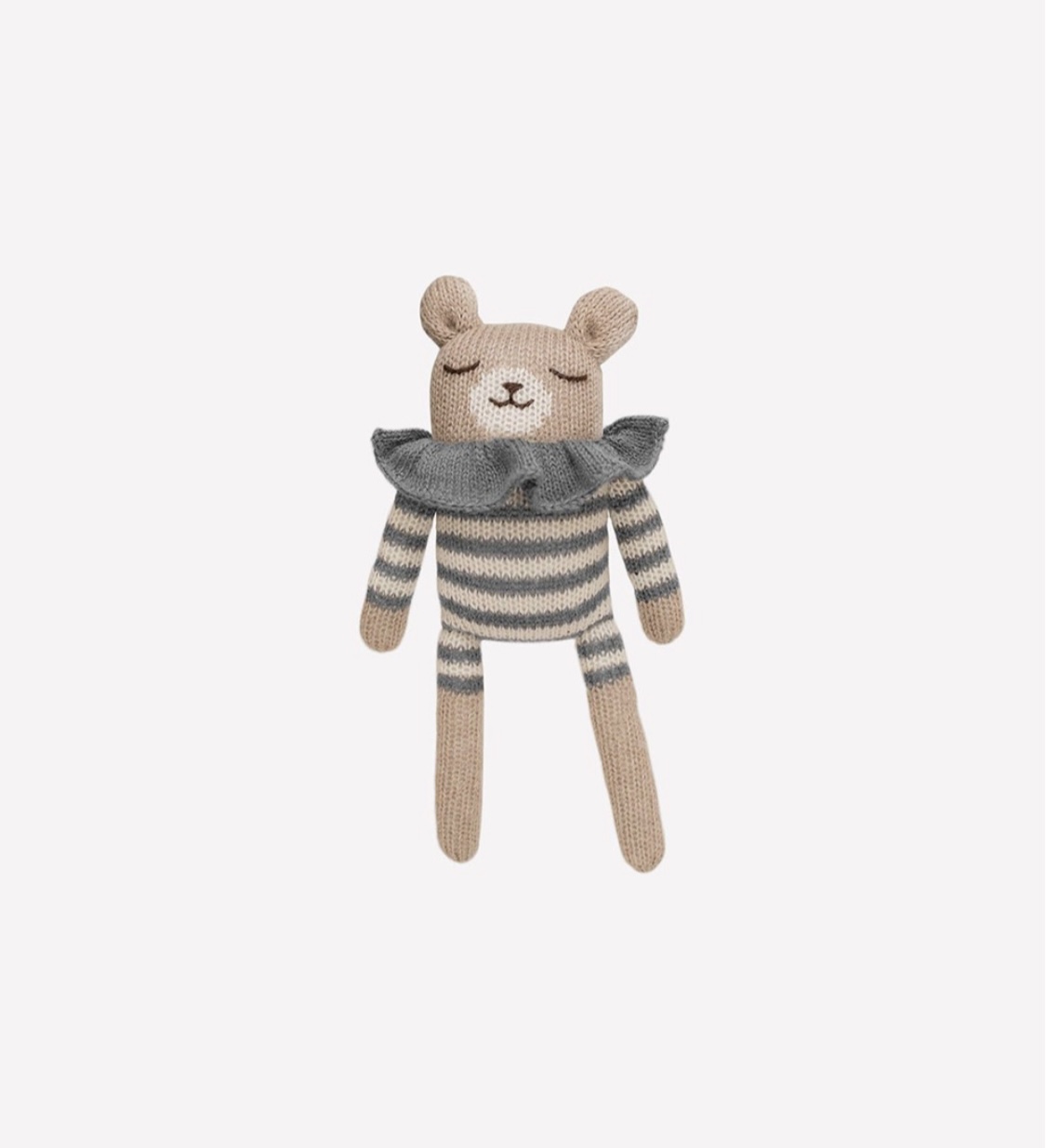 Avec sa combinaison rayée et son petit col, notre doudou ourson fera craquer les petits comme les grands ! Sa taille idéale pour les petites mains en fait un joli cadeau de naissance. Il est réalisé en pure laine baby alpaga, une matière antibactérienne très douce, particulièrement adaptée aux peaux sensibles des bébés.
